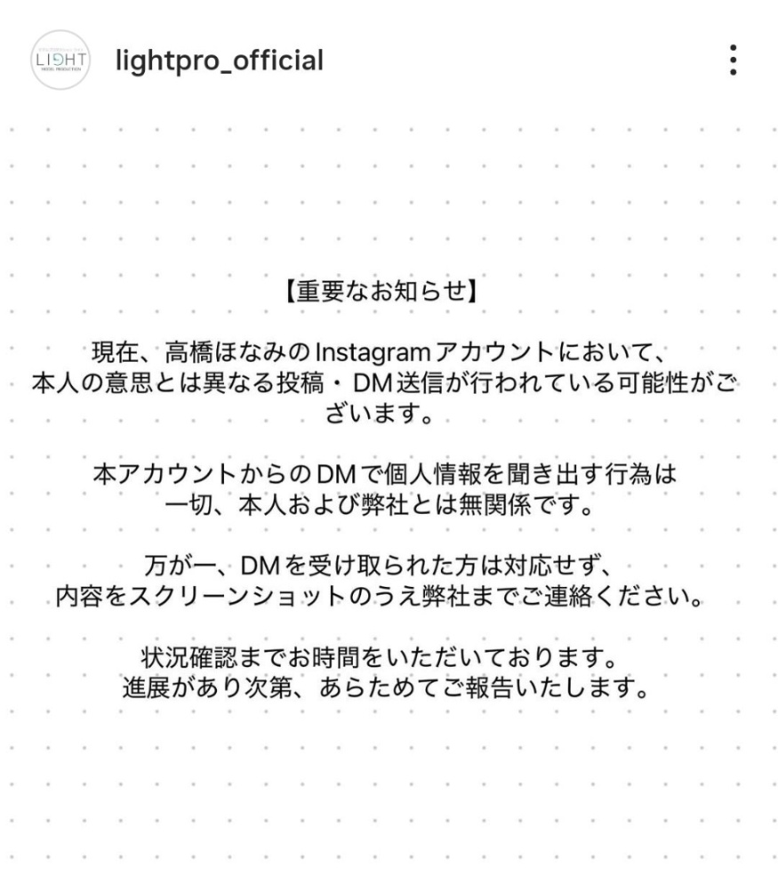 简单来翻一下意思:经纪公司LIGHT是在声明中表示,高桥ほなみ(高桥保奈美)的IG帐号有可能会出现非本人的发文及发送私讯(DM),如果那个帐号透过私讯询问个人资讯,那跟经纪公司以及高桥本人完全没关系,请千万不要回应,并且立刻截图和事务所联络〜
