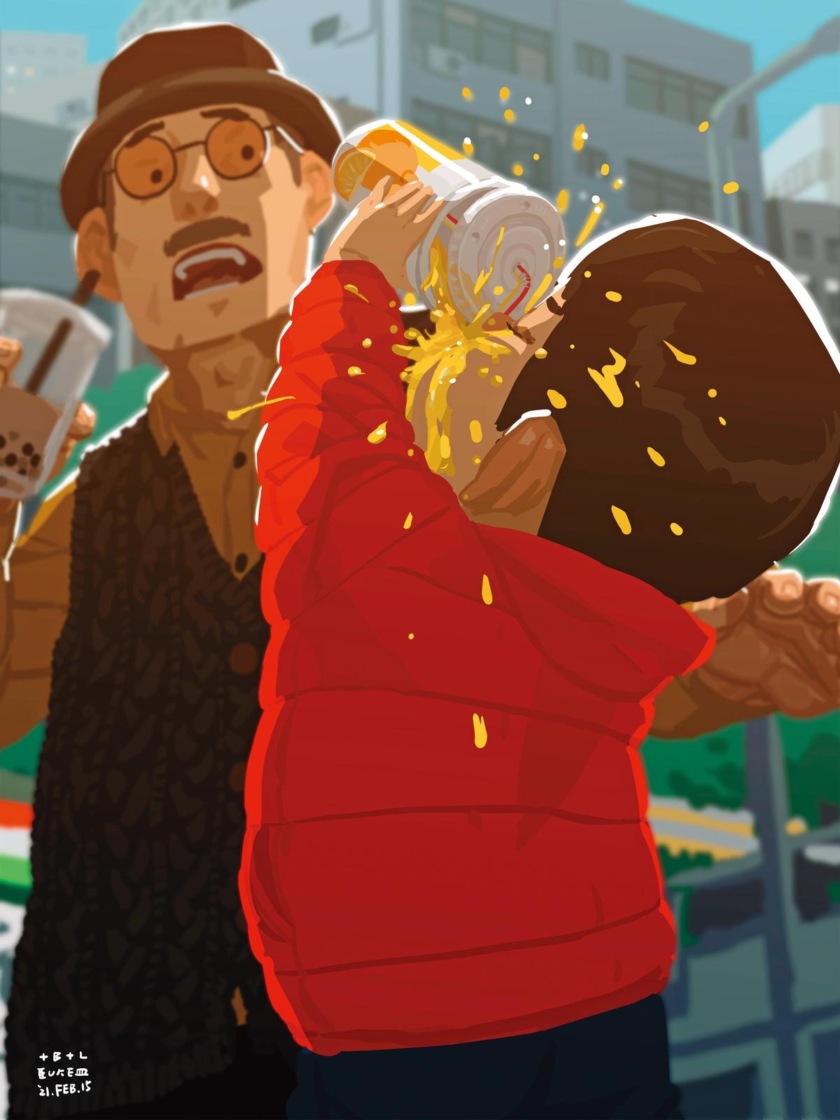 仰头就口,饮料一泻脸上。