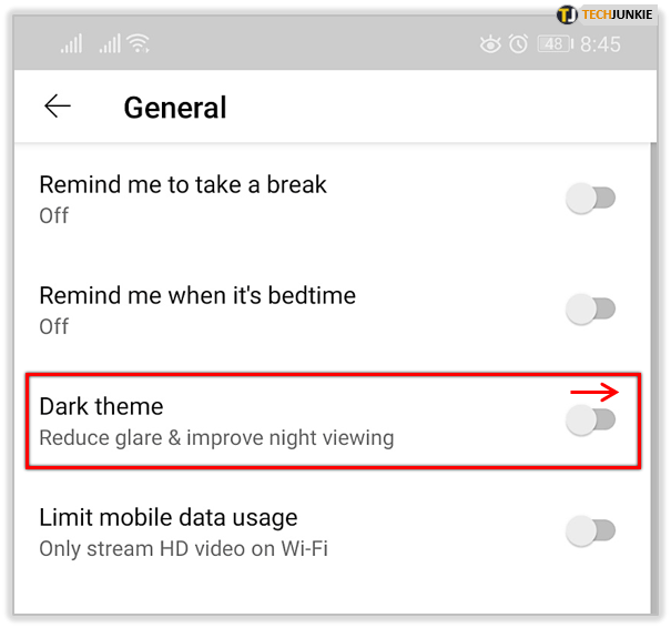 • 这应该会使您的 YouTube 应用变暗。如果你想再次回到浅色模式,你可以按照同样的方法轻松反转。