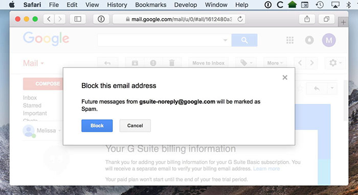 选择该选项,您将收到一条警告以确认您的操作。一些个人和公司使用多个电子邮件地址,因此请使用此窗口确认您阻止了正确的地址。另请注意,要完全阻止特定发件人或组织,您可能需要阻止来自不同电子邮件地址的其他邮件。