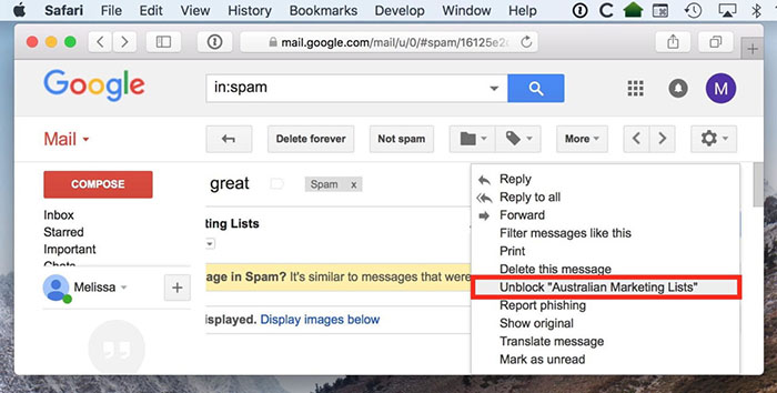 ...然后从您已阻止的发件人处找到一条消息。如果你回到上面我的第一个屏幕截图中指出的那个小箭头,你会发现新的“取消阻止”选项。