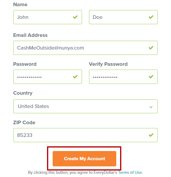 - 填写必填字段,包括您的全名、电子邮件地址和密码、当前居住国家/地区、州和邮政编码。 EveryDollar 目前仅适用于美国和加拿大境内的居民,因此请在继续之前考虑到这一点。