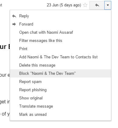 首先,从您需要在 Gmail 收件箱中屏蔽的电子邮件地址打开一封邮件。然后按电子邮件右上角的更多按钮。这将打开下面快照中显示的菜单。