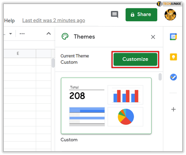 3. 在电子表格右侧出现的弹出窗口中单击自定义。该按钮位于您当前主题的名称旁边。