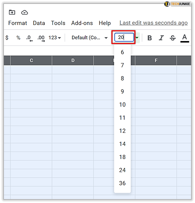 2. 导航到窗口顶部的工具栏,然后单击字体名称旁边的数字。