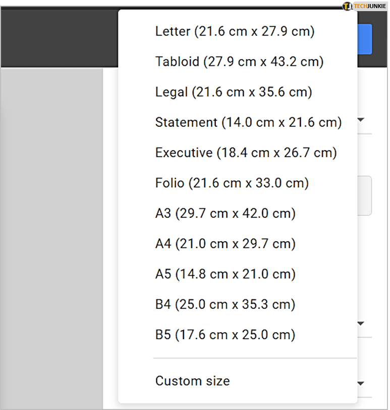 单击“纸张大小”后,您会注意到各种选项。最常见的纸张尺寸是“Letter”、“Legal”和“Tabloid”。此外,还可以自定义尺寸。