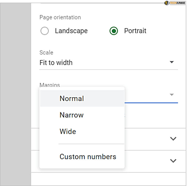 比例让用户选择他们希望文档如何适合页面。 “边距”允许您调整边际空间的大小。它可以是“正常”、“宽”或“窄”。