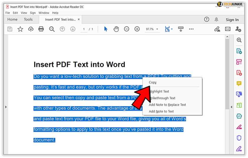 打开 PDF 后,突出显示并“复制”您需要的文本.接下来,转到您的 Word 文档并粘贴 PDF 文本信息。