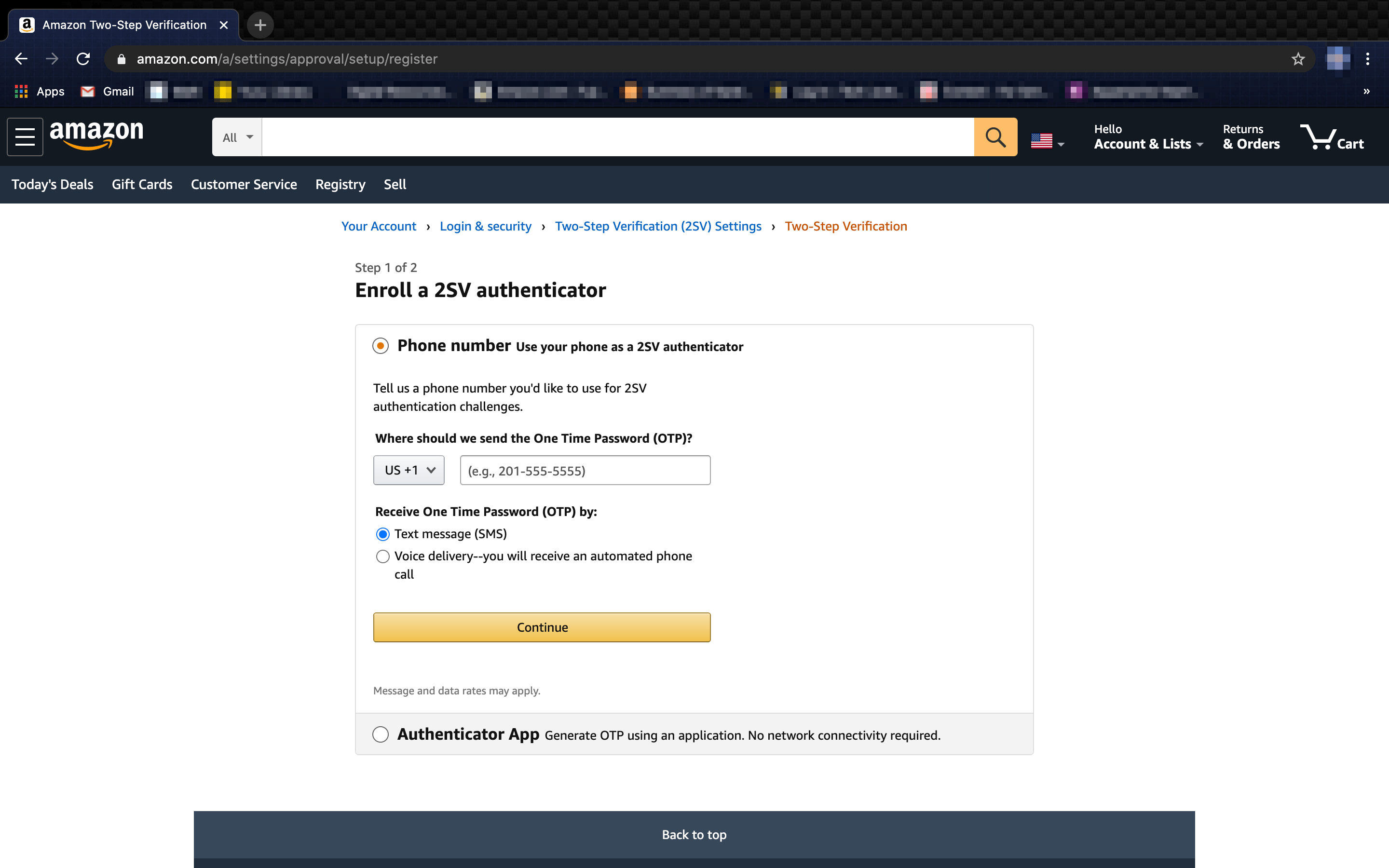 - 扫描后,将在您的身份验证器应用程序上为创建的帐户弹出一个新代码。在亚马逊网站上提供的字段中输入这些数字,然后在代码到期之前点击验证 OTP 并继续。