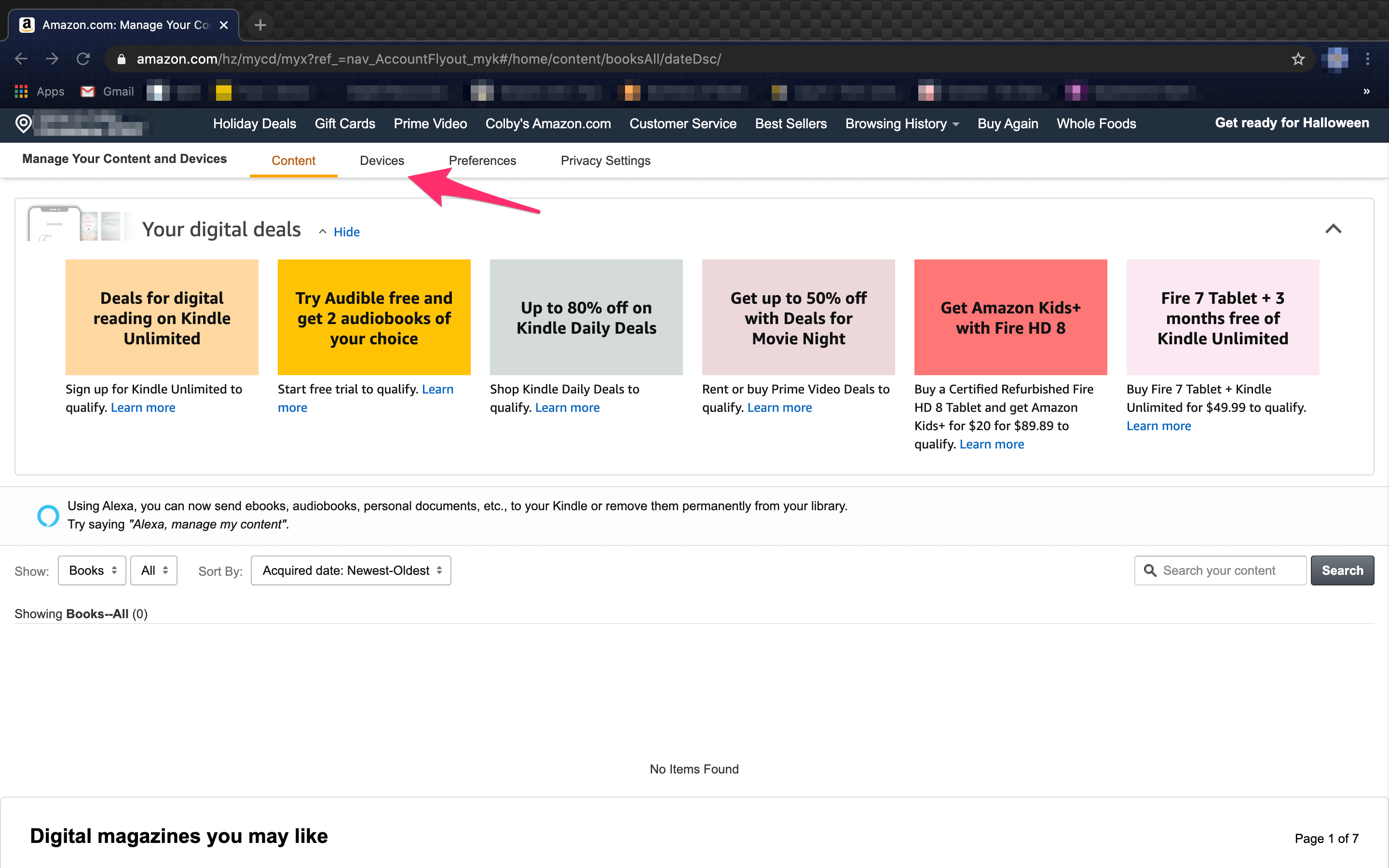 - 使用您当前的凭据登录,将光标悬停在“帐户和放大器”上;列表”下拉菜单。选择您的内容和设备。