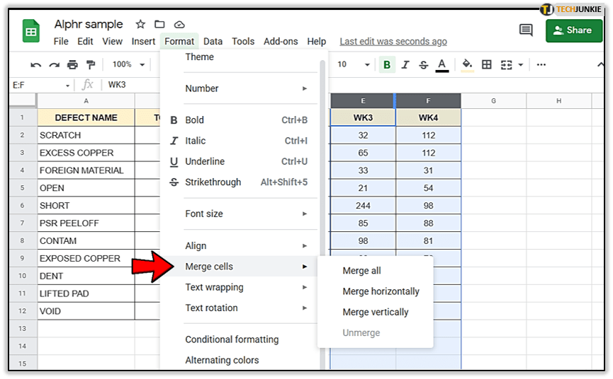 另外,如果你想合并行或列,也需要点击几下。选择要加入的行和列,然后转到 Google 表格工具栏。选择“格式>合并单元格”,就是这样。