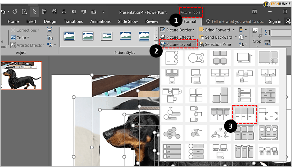 5. 导航到“图片工具格式”选项卡,然后在下拉菜单中选择“图片布局”。然后 PowerPoint 将拍摄您选择的所有照片并对其进行裁剪、调整大小和定位,使其适合整个空白文件。图片会并排排列。