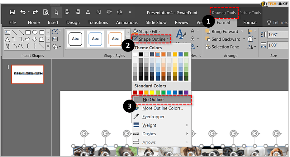 5. 使用 Ctrl+A 选择所有照片,然后导航到“绘图工具”并选择“形状轮廓”。选择“无轮廓”选项。