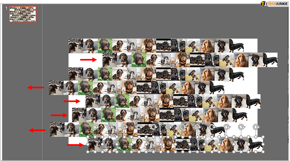 7. 继续按 Ctrl+D 直到用多行照片填满整个 PowerPoint 文件。按 Ctrl+D 的同时,在随机位置移动一组图像。