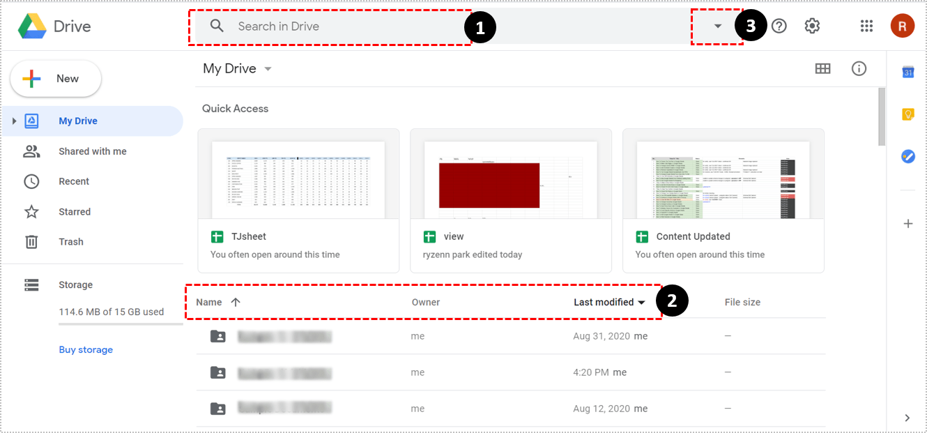 2. 您的所有 Google 表格文件最初都是按照从最近到最旧的顺序排列的。其他排序选项包括按“名称”和“上次修改时间”排序。