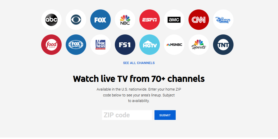 某些频道会根据任何地区受到限制,但可能包括 ABC、Fox、CBS、NBC、AMC、BBC America、Bravo、FS1、E!、ESPN、Fox、FX、MSNBC、国家地理、StartTV、Sundance TV、SyFy、TNT、USA 和 YouTube Originals。输入邮政编码后,即可在网页上查看完整列表。