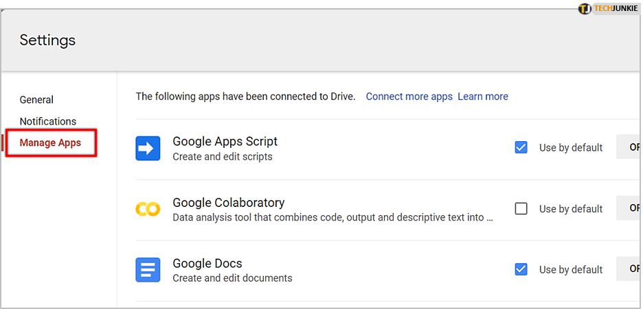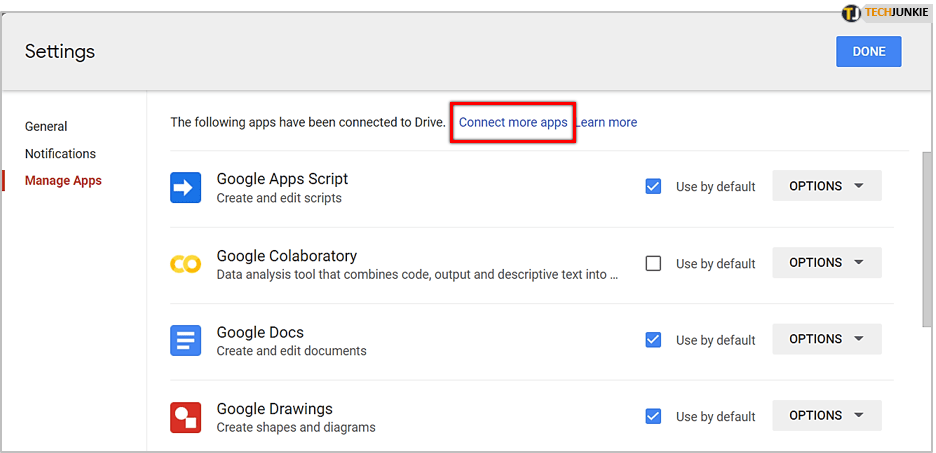在这个窗口中,您可以看到您已经连接了哪些应用程序。谷歌的办公应用程序很可能会出现在那里,文档、表格等。向下滚动窗口以查看已启用的应用程序。要添加更多应用,请选择窗口顶部的连接更多应用文本链接。