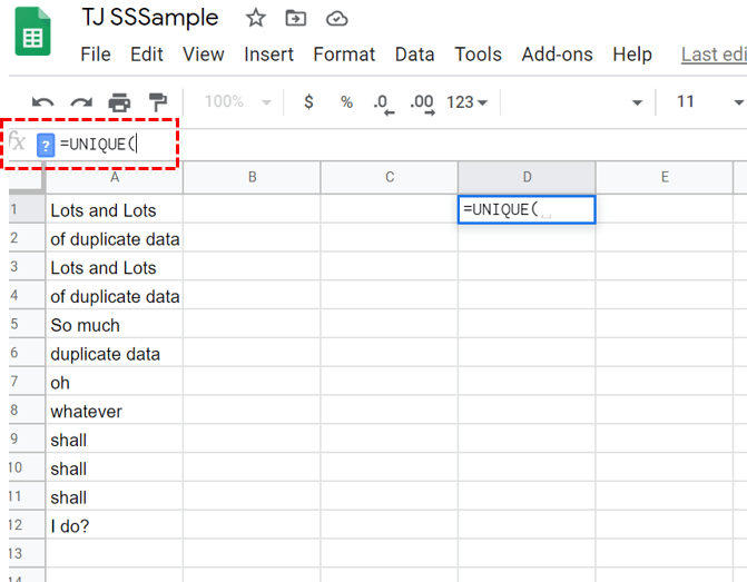 - 在数据上方的公式框中键入“=UNIQUE(”。