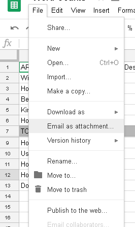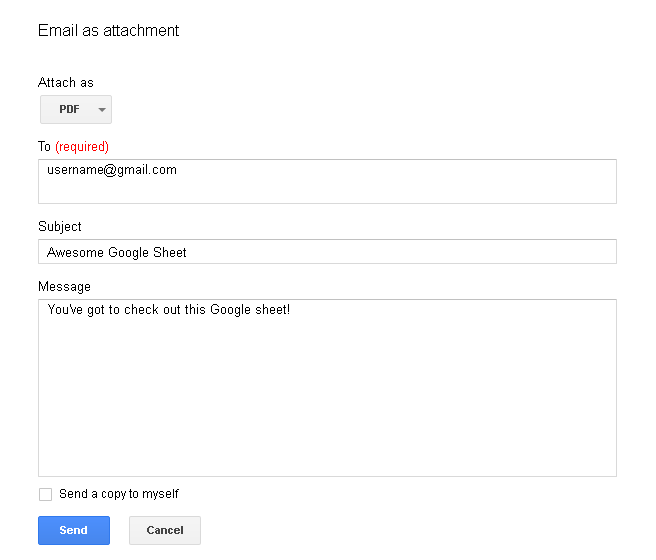 使用此选项,您可以通过电子邮件将 Google 表格作为 PDF 或.xlsx 文件发送。只需在“附加为”下拉菜单中做出选择。