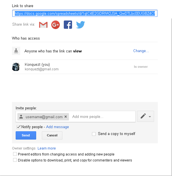 8.  您现在可以访问与以前相同的共享 URL,尽管这些选项现在只能通过右侧的 更改... 链接进行交换。您现在可以通过单击关联的徽标直接将链接分享到 Gmail、Google+、Facebook 和 Twitters。现在出现了一个“通知他人”复选框,您可以通过添加消息向收到工作表副本的人留言。您还可以通过勾选相应的框来选择将副本发送给自己。