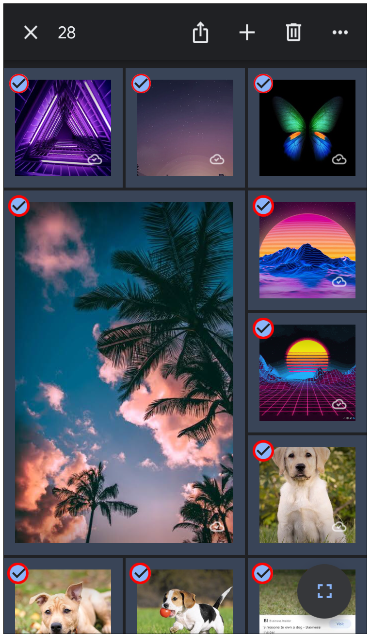 2. 突出显示要分享的所有照片,然后点按屏幕右上角的加号图标。