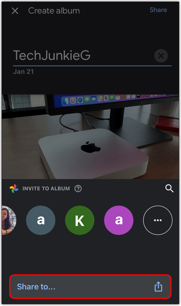 5. 进入相册后,点击分享图标并写下您想要分享链接的人的电子邮件。