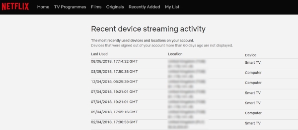 第 4 步会准确列出访问了您的 Netflix 帐户的设备及其 IP 地址和位置。该位置可能不准确,具体取决于您的 ISP 连接位置。这可能取决于一天中的时间、任何升级或计划的工作以及一系列其他原因。它应该始终相对靠近,但可能无法识别您的确切社区或城镇。不过设备应该更能说明问题。