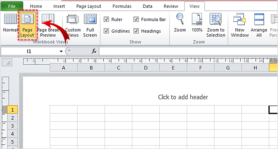 2. 从工具栏中选择“页面布局视图”。