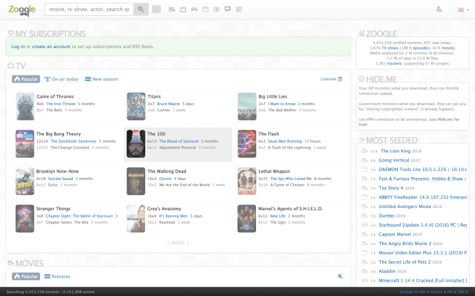 Zooqle 出现在列表中,因为他们获得了 Bitsnoop 的所有数据。 Bitsnoop 是最大的种子数据库之一,但是,它们被关闭了。因此,他们将 1800 万个文件(torrent 历史上最大的数据库之一)发送到 Zooqle。如果您想要广泛的选择,请务必查看它们。