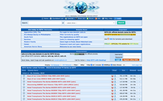 如您所知,原始种子网站 EZTV 已于 2015 年因域名所有权问题而关闭。然而,它重新组合并现在在 EZTV.ag 下运行,它允许它继续发布经过验证的种子。使用起来轻而易举,并且不专注于任何花哨的事情,但仍然可以满足您的需求。还有一个论坛页面,您可以在其中讨论种子和其他主题,以及新发布节目的倒计时列表。