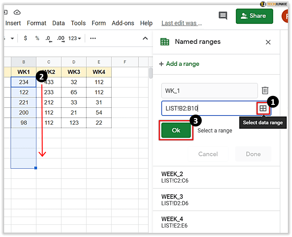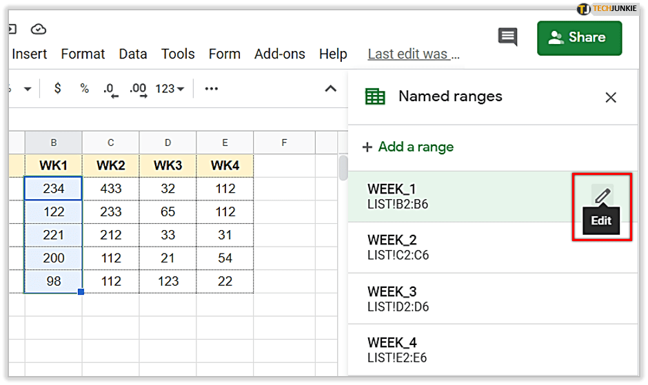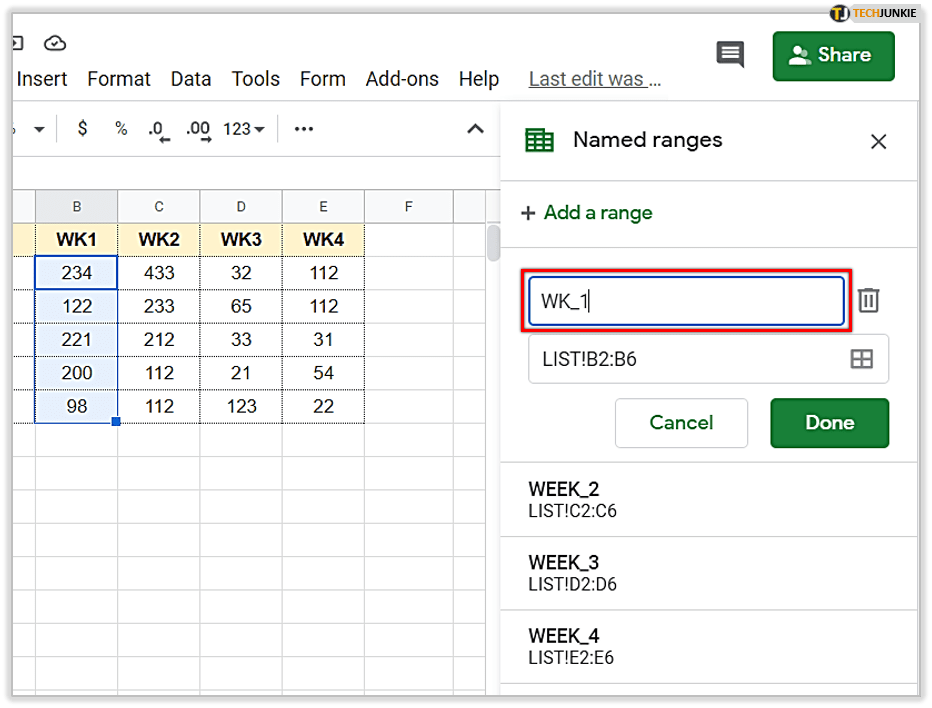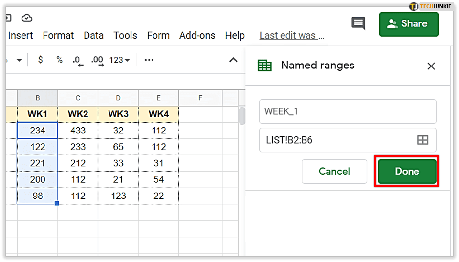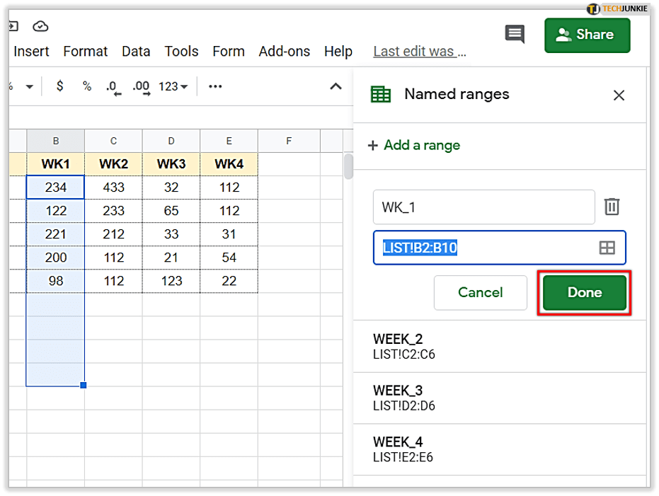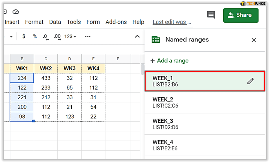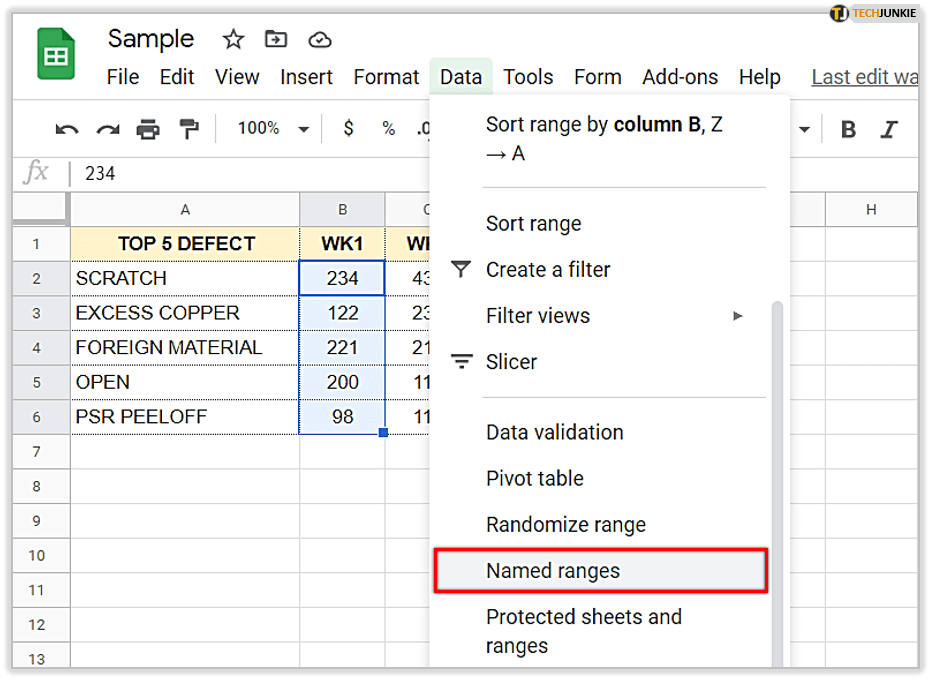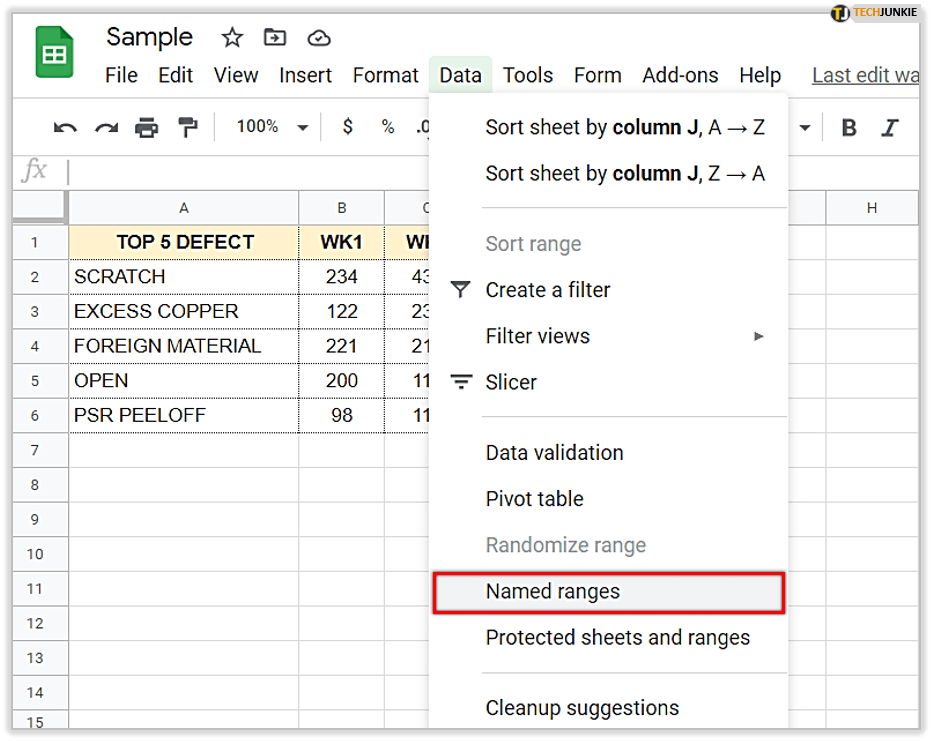 有时,声明范围的单元格可能会令人困惑,尤其是当您有多个范围需要处理时。幸运的是,Google Sheets 允许您命名特定范围,以便您知道它们包含的确切数据。如果您的数据库包含数百个甚至数千个数据点,这当然很有用。要创建命名范围,您可以执行以下步骤: