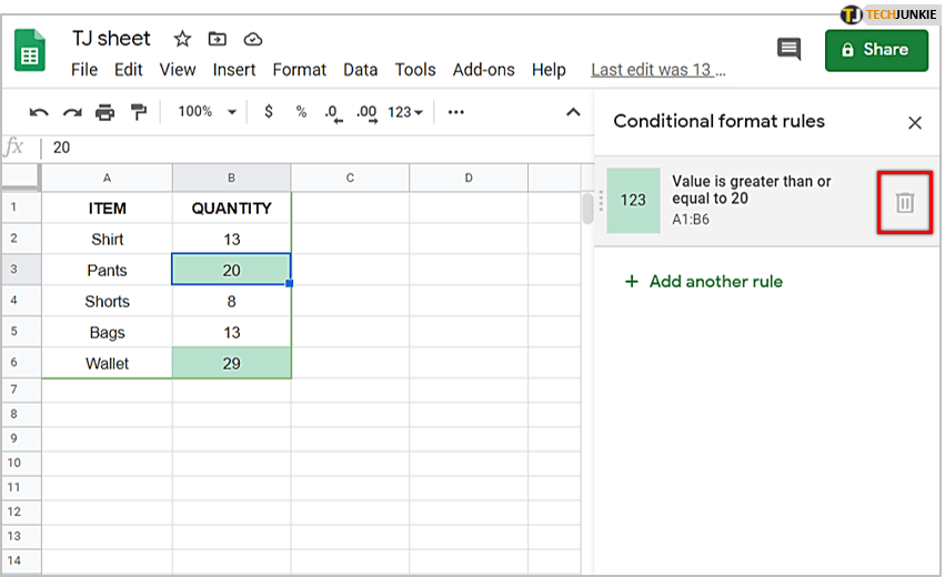 5. 格式规则旁边有一个小的垃圾桶图标。点击这里删除规则。
