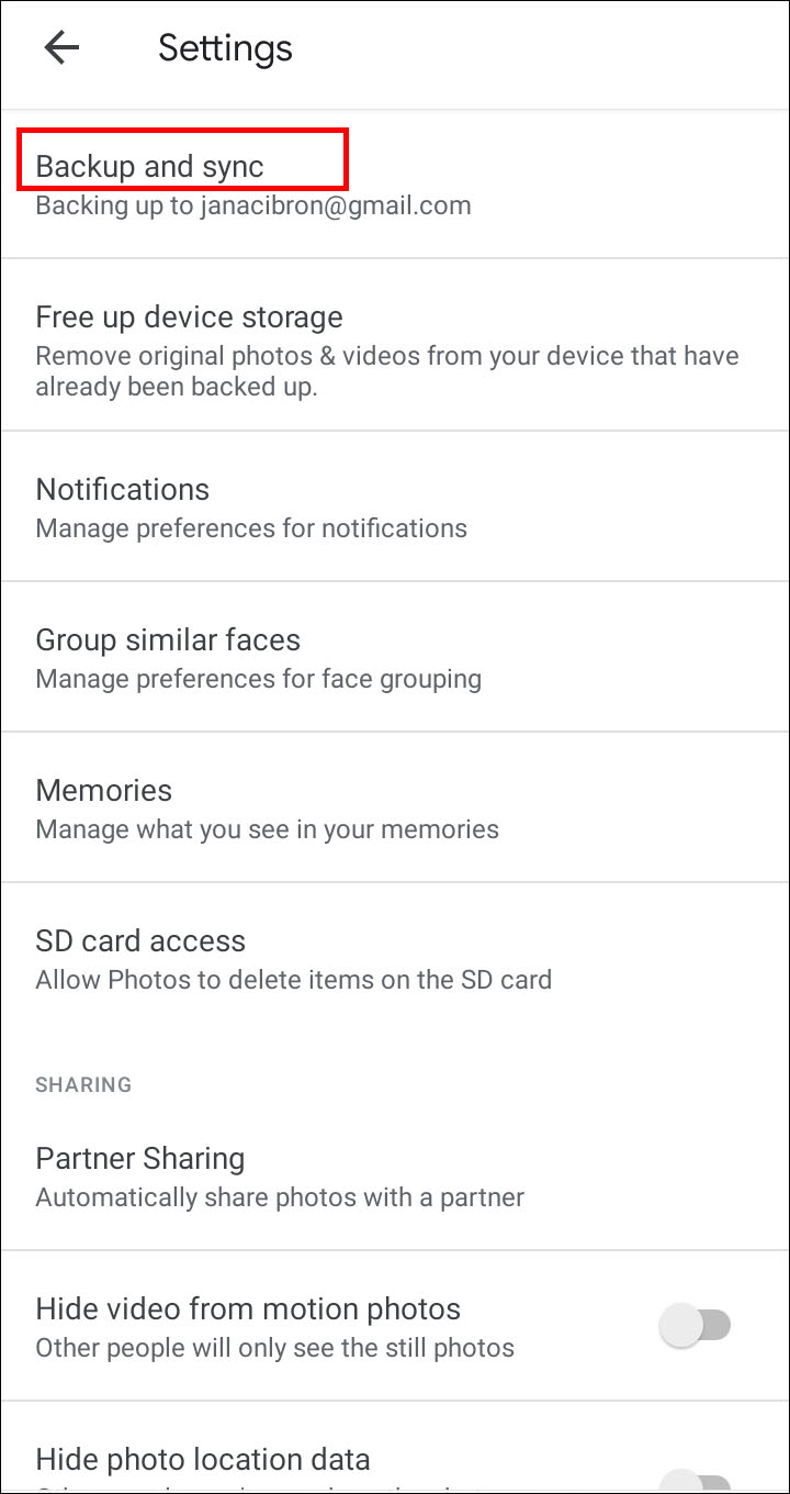 Google 相册将您的图片存储在您的设备和云端。如果您想释放一些空间,您可以从您的设备中删除 Google 相册图片。只需打开应用程序单击右上角的菜单。导航到“设置”,然后“备份和同步”。如果您看到一个交叉的云图标,则您的文件未同步到云。打开同步并等待,然后再打开它关闭。导航回应用设置并选择“释放设备存储空间”以清除您的图库。