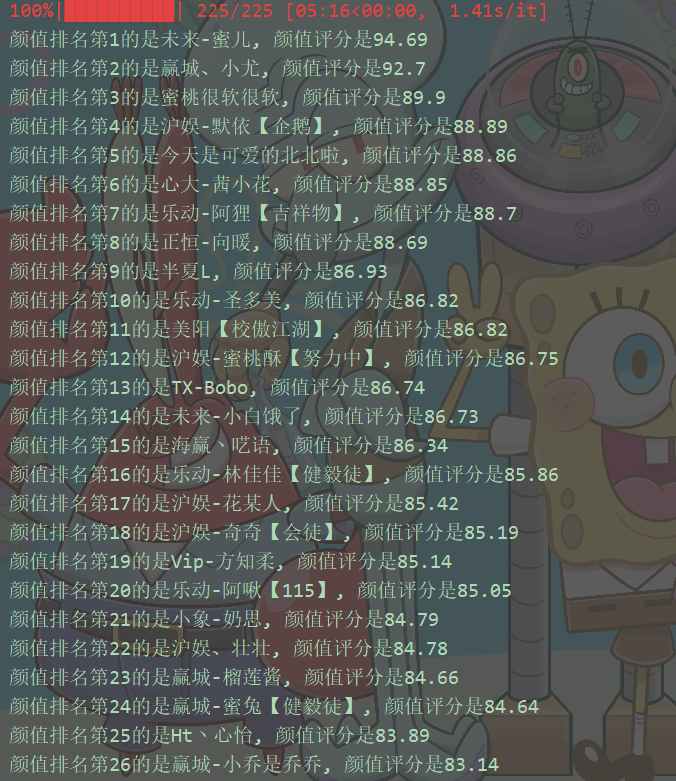 print(f'颜值排名第{num}的是{index["主播"]}, 颜值评分是{index["颜值"]}')