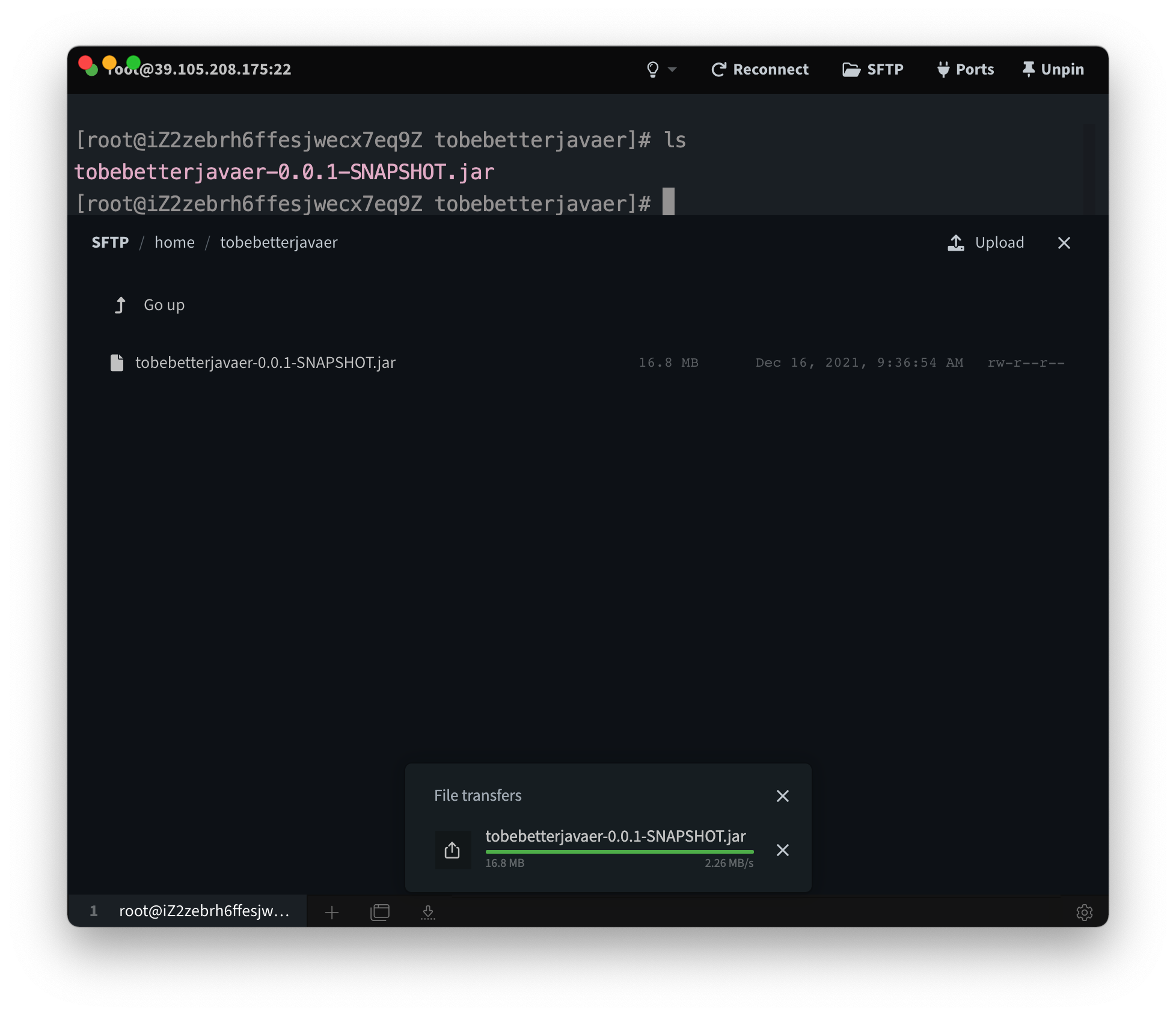 利用终端工具 Tabby,将 jar 包上传到服务器,