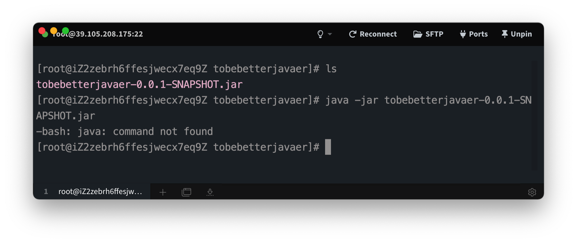 安装好 JDK 后,再次执行命令就可以看到 Spring Boot 项目可以正常在服务器上跑起来了,