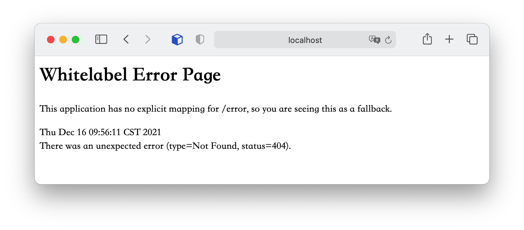 咦,竟然 Whitelabel 了,这个 404 页面是 Spring Boot 默认的错误页面,表示我们的请求在 Web 服务中不存在,