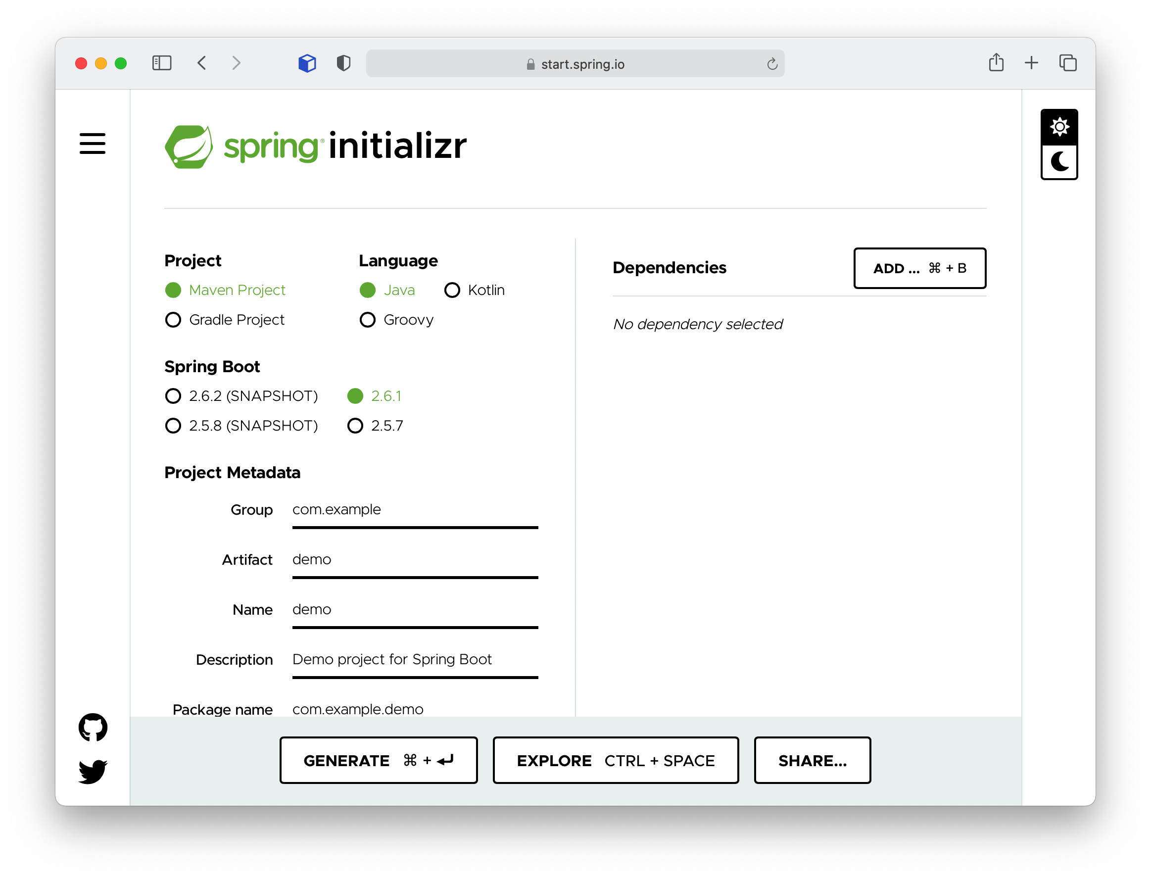 好,接下来我们使用 Spring Initializr 初始化一个 Web 项目,Project 选择 Maven,Spring Boot 选择 2.6.1,Java 选择 JDK 8,Dependencies 选择「Build web, including RESTful, applications using Spring MVC. Uses Apache Tomcat as the default embedded container.」