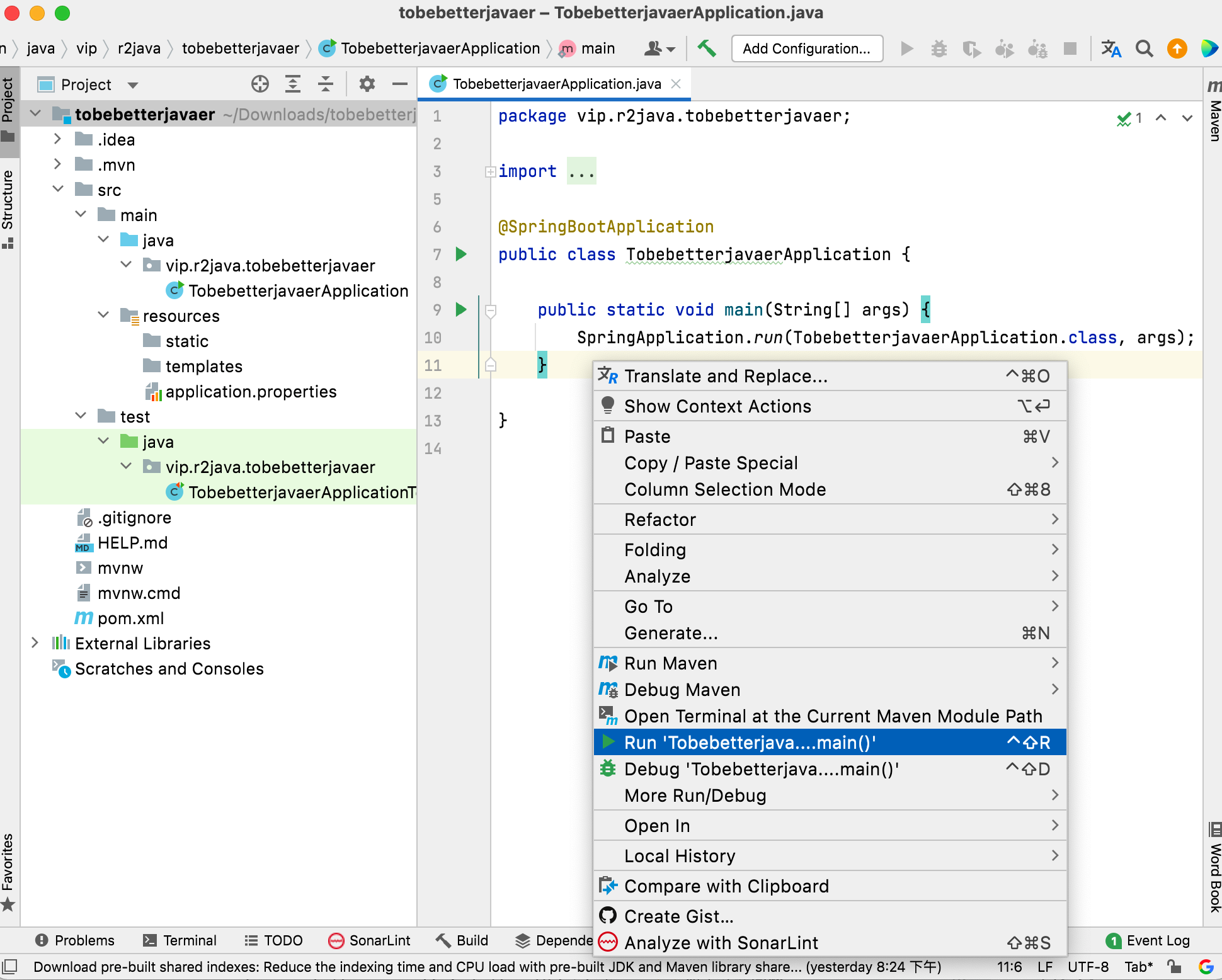 第一次启动,我个人习惯在 main 类中右键,在弹出的右键选单这种选择「run … main()」启动,