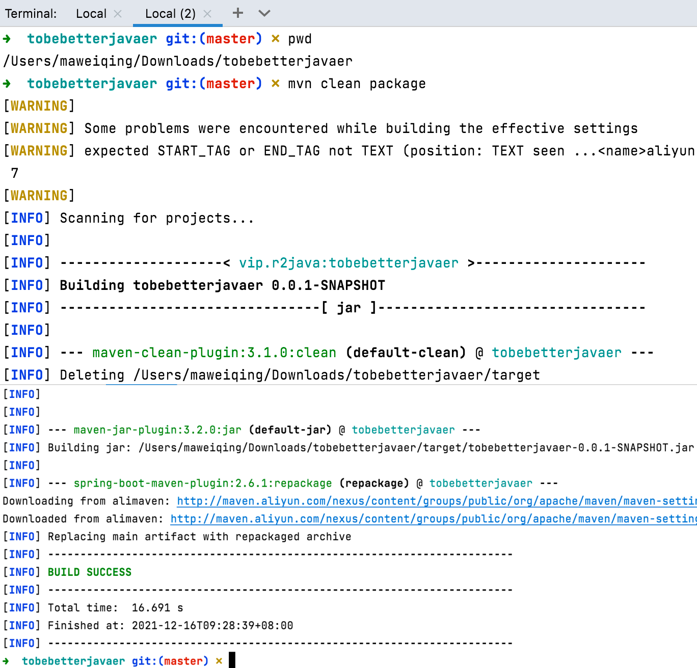 打开 Terminal 终端, 执行命令 mvn clean package,等待打包结果,