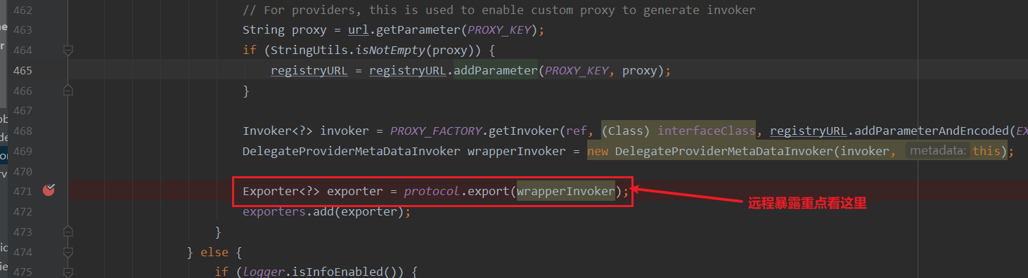 而且根据下图中444行,可以知道dubbo暴露服务是可以支持多个协议的,也就是每一种协议都会暴露一份(我们组态档只配置了dubbo协议)