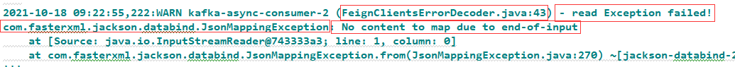 匹配第1个Pattern 匹配结果: ('WARN', 'FeignClientsErrorDecoder.java', '43', ' - read Exception failed!', 'com.fasterxml.jackson.databind.JsonMappingException', ': No content to map due to end-of-input', '\n    at ')