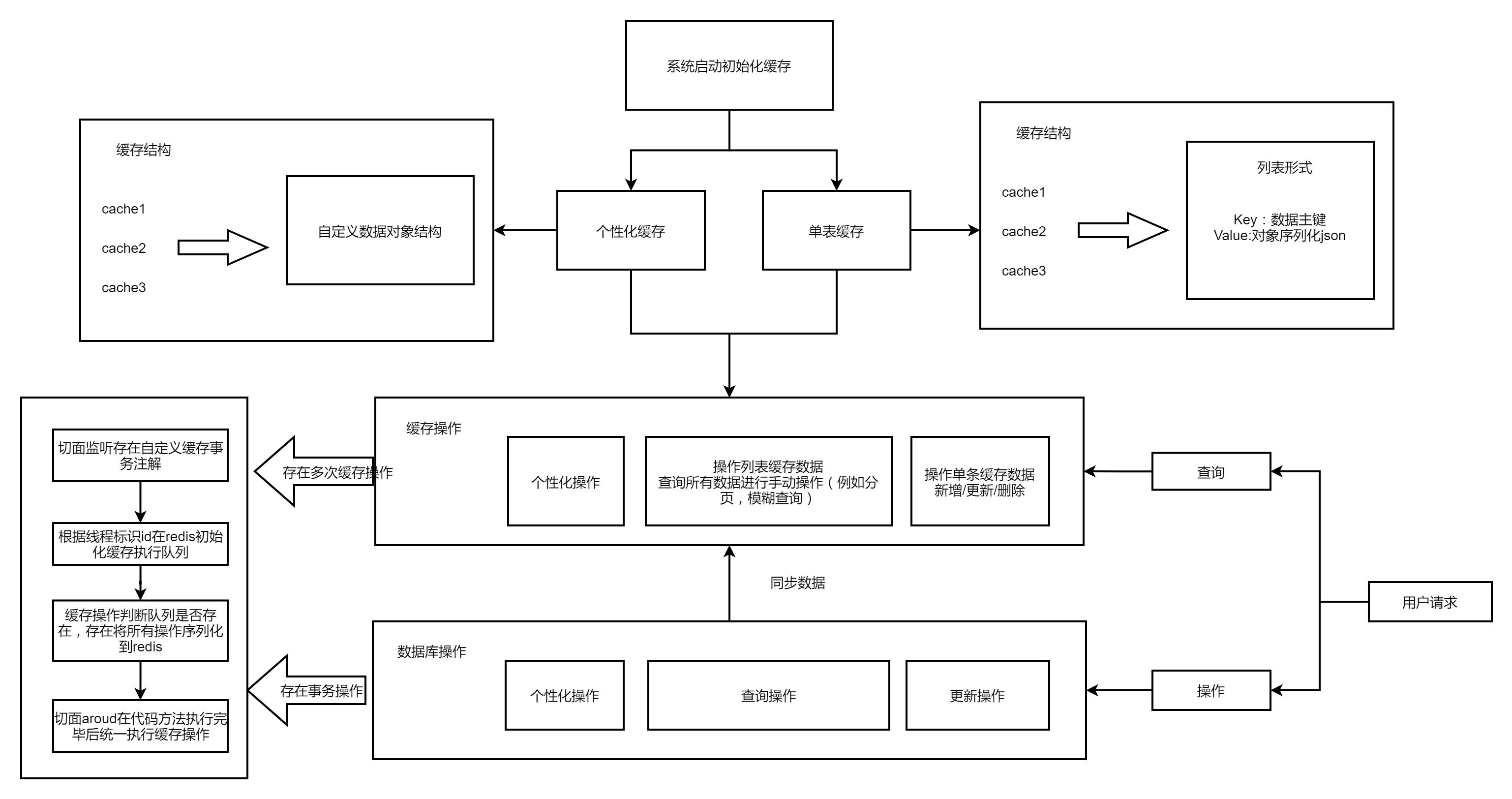 公司部门老项目要迁移升级java版本,需要进行快取相关操作,原框架未支持这部分,经过调研java相关快取方案大致分为ehcache和redis两种,redis的value最大值为500mb且超过1mb会对存取有性能影响,业务系统需要支持串列查询快取就不可避免的涉及到大量的资料存取过滤,ehcache支持存储器+磁盘快取不用担心快取容量问题,所以框架初步版本决定集成ehcache3,设计流程结构如下图所示
