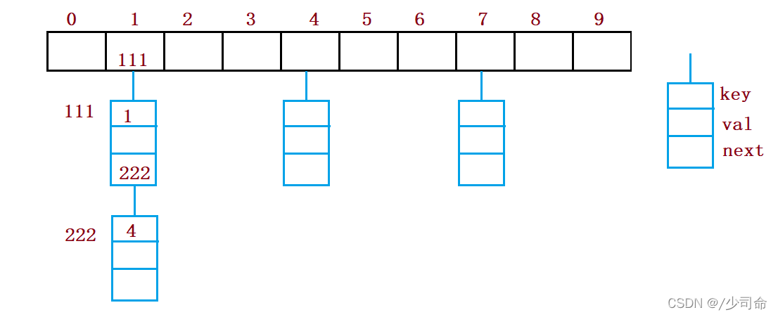 线性探测的缺陷是产生冲突的资料堆积在一块,这与其找下一个空位置有关系,因为找空位置的方式就是挨 着往后逐个去找,因此二次探测为了避免该问题,找下一个空位置的方法为: = ( + )% m, 或者: = ( - )% m,其中:i = 1,2,3…, 是通过散列函式Hash(x)对元素的关键码 key 进行计算得到的位置, m是表的大小, 对于2.1中如果要插入44,产生冲突,使用解决后的情况为: