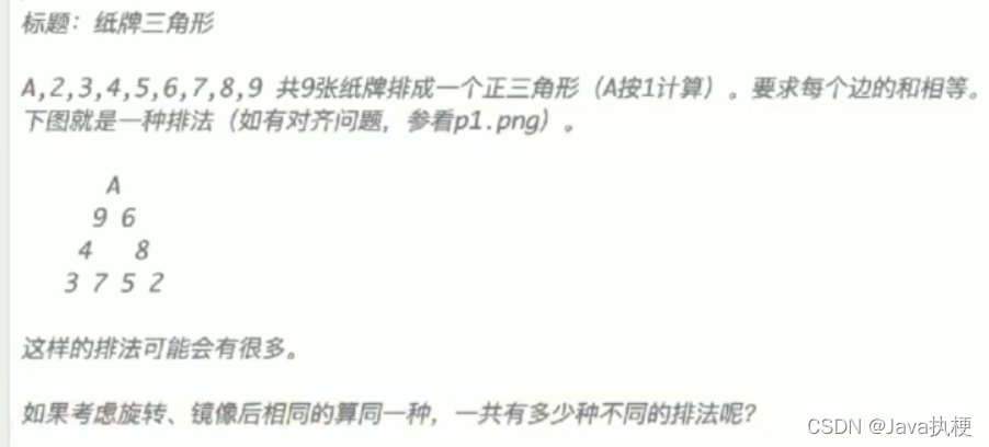这些题目做下来,很明显能感觉到全排列对于蓝桥杯而言的重要性,毕竟凑算式和纸牌三角形你可以用多个for回圈解决,可像纸牌总类这种题目你确是不可信的,但是如果在蓝桥杯的赛场上发现可以用多层for回圈解决,你又不会全排列或者不熟,别担心,大胆去尝试,毕竟能找到答案的方法就是好方法,我们的目的只是为了得到答案,