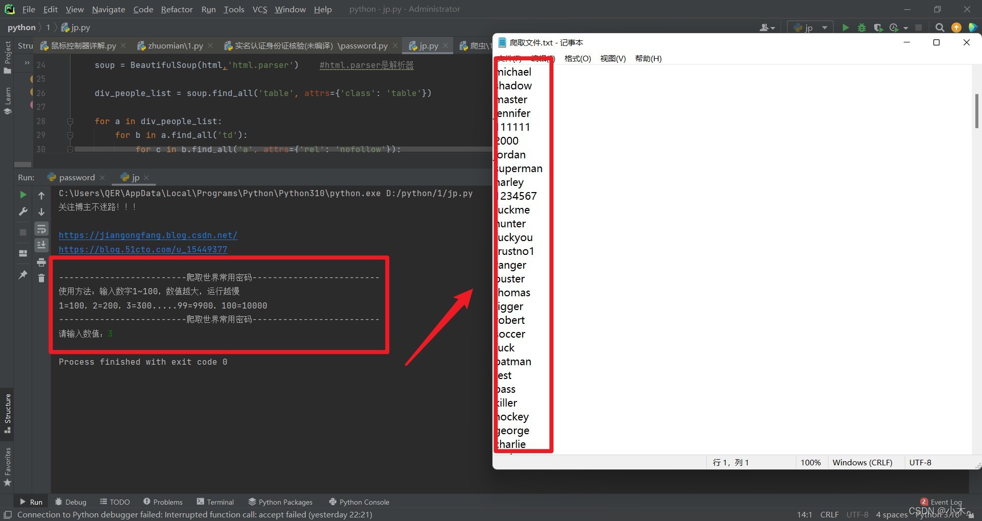 inpu = input('关注博主不迷路!!!\n\nhttps://jiangongfang.blog.csdn.net/\nhttps://blog.51cto.com/u_15449377\n\n-------------------------爬取世界常用密码-------------------------\n使用方法:输入数字1~100,数值越大,运行越慢\n1=100,2=200,3=300.....99=9900,100=10000\n-------------------------爬取世界常用密码------------------------- \n请输入数值:')