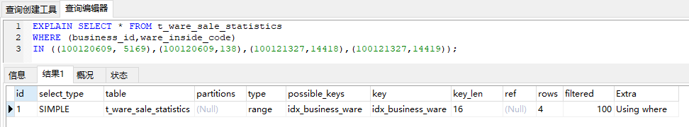 同样是利用 Mybatis 的 动态 SQL ,将 business_id 串列拼在一起、 ware_inside_code 拼在一起,类似如下