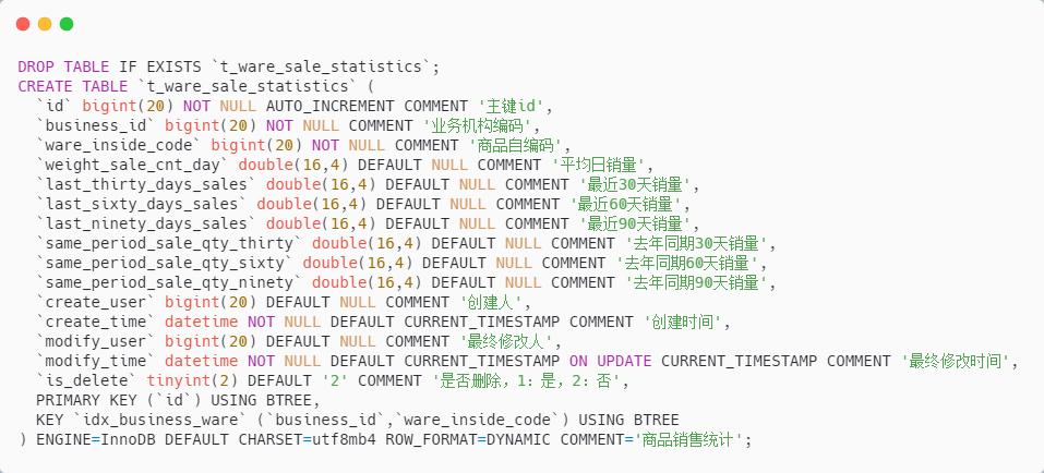 DROP TABLE IF EXISTS `t_ware_sale_statistics`;CREATE TABLE `t_ware_sale_statistics` (  `id` bigint(20) NOT NULL AUTO_INCREMENT COMMENT '主键id',  `business_id` bigint(20) NOT NULL COMMENT '业务机构编码',  `ware_inside_code` bigint(20) NOT NULL COMMENT '商品自编码',  `weight_sale_cnt_day` double(16,4) DEFAULT NULL COMMENT '平均日销量',  `last_thirty_days_sales` double(16,4) DEFAULT NULL COMMENT '最近30天销量',  `last_sixty_days_sales` double(16,4) DEFAULT NULL COMMENT '最近60天销量',  `last_ninety_days_sales` double(16,4) DEFAULT NULL COMMENT '最近90天销量',  `same_period_sale_qty_thirty` double(16,4) DEFAULT NULL COMMENT '去年同期30天销量',  `same_period_sale_qty_sixty` double(16,4) DEFAULT NULL COMMENT '去年同期60天销量',  `same_period_sale_qty_ninety` double(16,4) DEFAULT NULL COMMENT '去年同期90天销量',  `create_user` bigint(20) DEFAULT NULL COMMENT '创建人',  `create_time` datetime NOT NULL DEFAULT CURRENT_TIMESTAMP COMMENT '创建时间',  `modify_user` bigint(20) DEFAULT NULL COMMENT '最终修改人',  `modify_time` datetime NOT NULL DEFAULT CURRENT_TIMESTAMP ON UPDATE CURRENT_TIMESTAMP COMMENT '最终修改时间',  `is_delete` tinyint(2) DEFAULT '2' COMMENT '是否洗掉,1:是,2:否',  PRIMARY KEY (`id`) USING BTREE,  KEY `idx_business_ware` (`business_id`,`ware_inside_code`) USING BTREE) ENGINE=InnoDB DEFAULT CHARSET=utf8mb4 ROW_FORMAT=DYNAMIC COMMENT='商品销售统计';