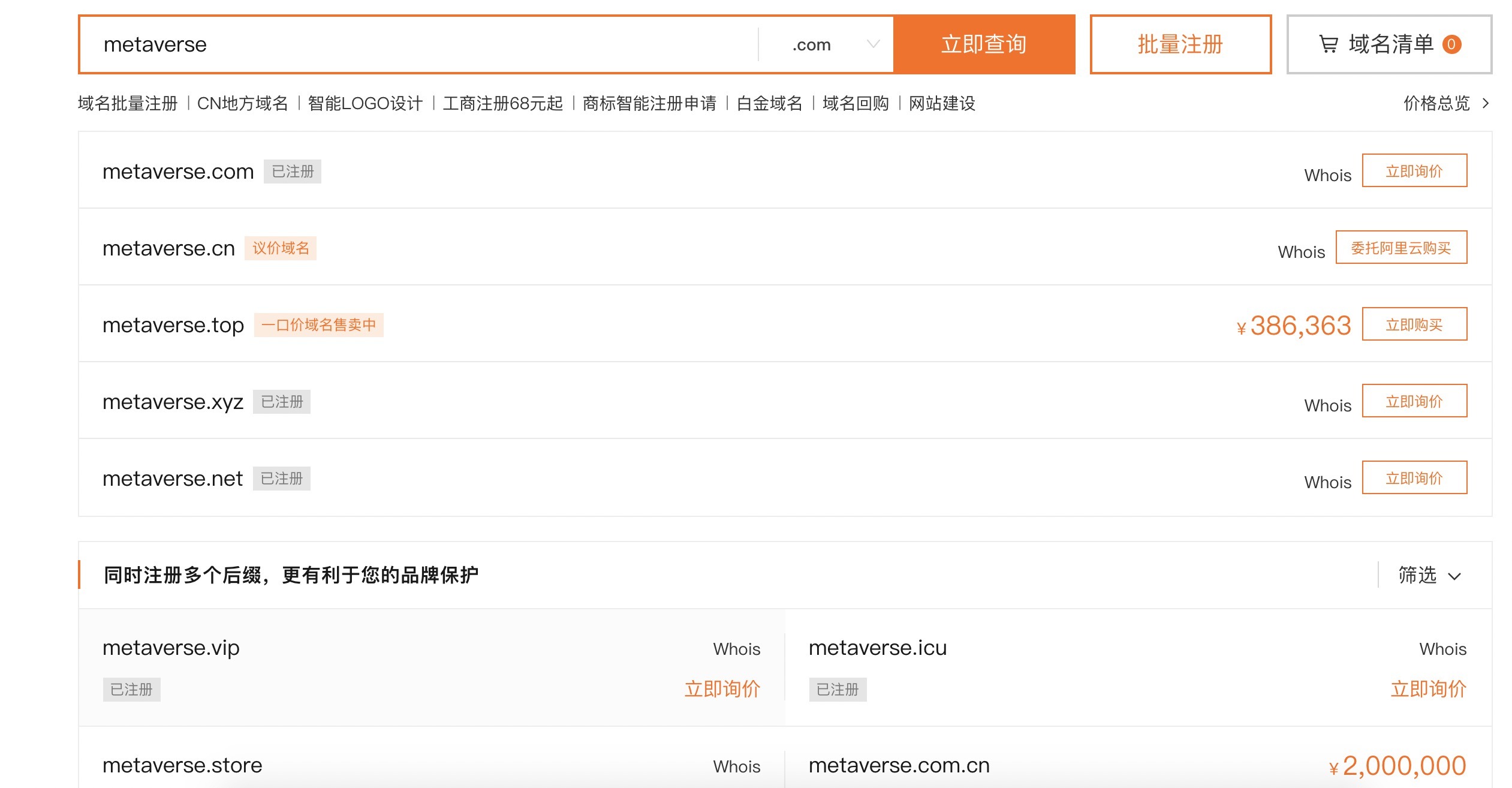 开发程序中可以通过IP访问不需要域名服务,但是上线后一定要搞个域名系结,可以从阿里云查询想要的域名是否还可用:https://wanwang.aliyun.com/domain/searchresult/#/?keyword=vector&suffix=com, 除了 .com 的域名外,其他域名相对都不贵,买到域名后需要备案,从购买域名到完成备案大概需要3周时间,所以购买域名一定要趁早,元宇宙(metaverse)相关的好的域名其实早就被注册