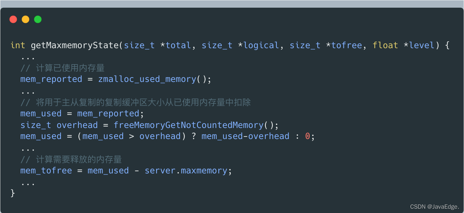 getMaxmemoryState评估当前存储器使用情况的时候,若发现已用存储器超出maxmemory,会计算需释放的存储器量,这个释放存储器大小=已使用存储器量-maxmemory,